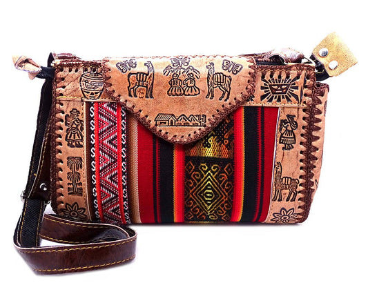 Large Tribal Peruvian Leather Material Crossbody Purse Bag