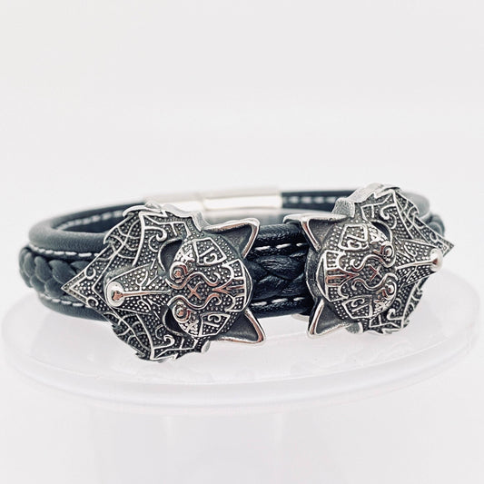Stainless Steel Double Wolf Head Leather Bracelet 18CM