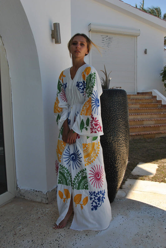 Colorful White Embroidered Ocean Caftan