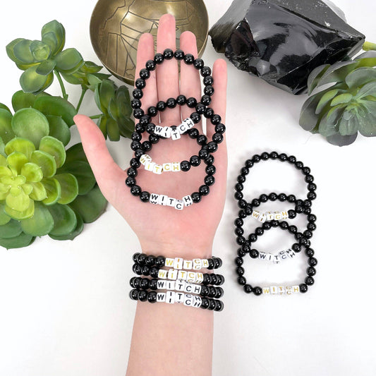 Black Obsidian Beaded Bracelet with "WITCH" Letter Beads - B: C- Black Bead Gold Lettering