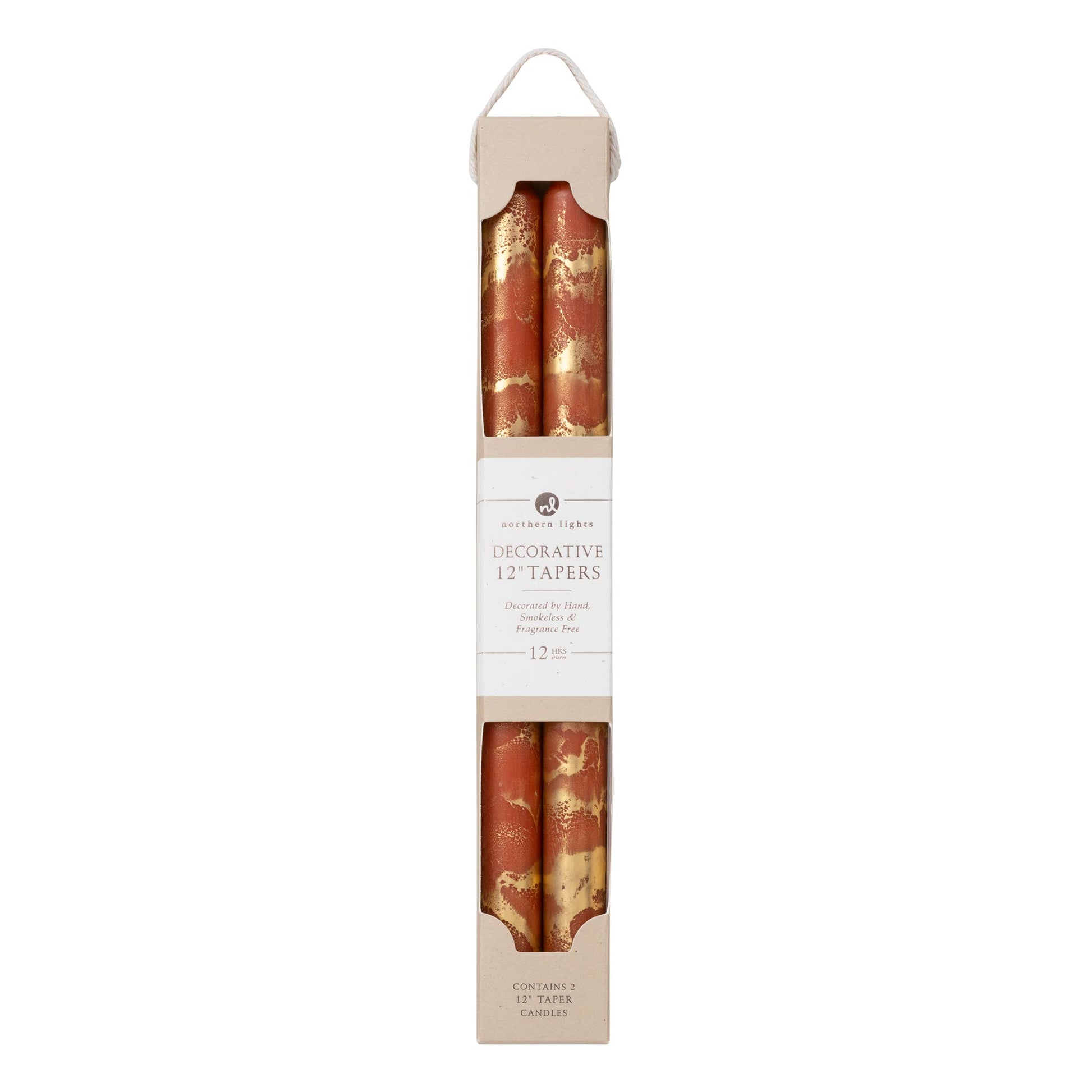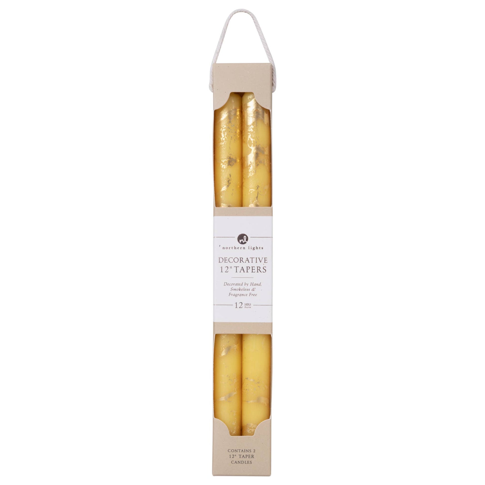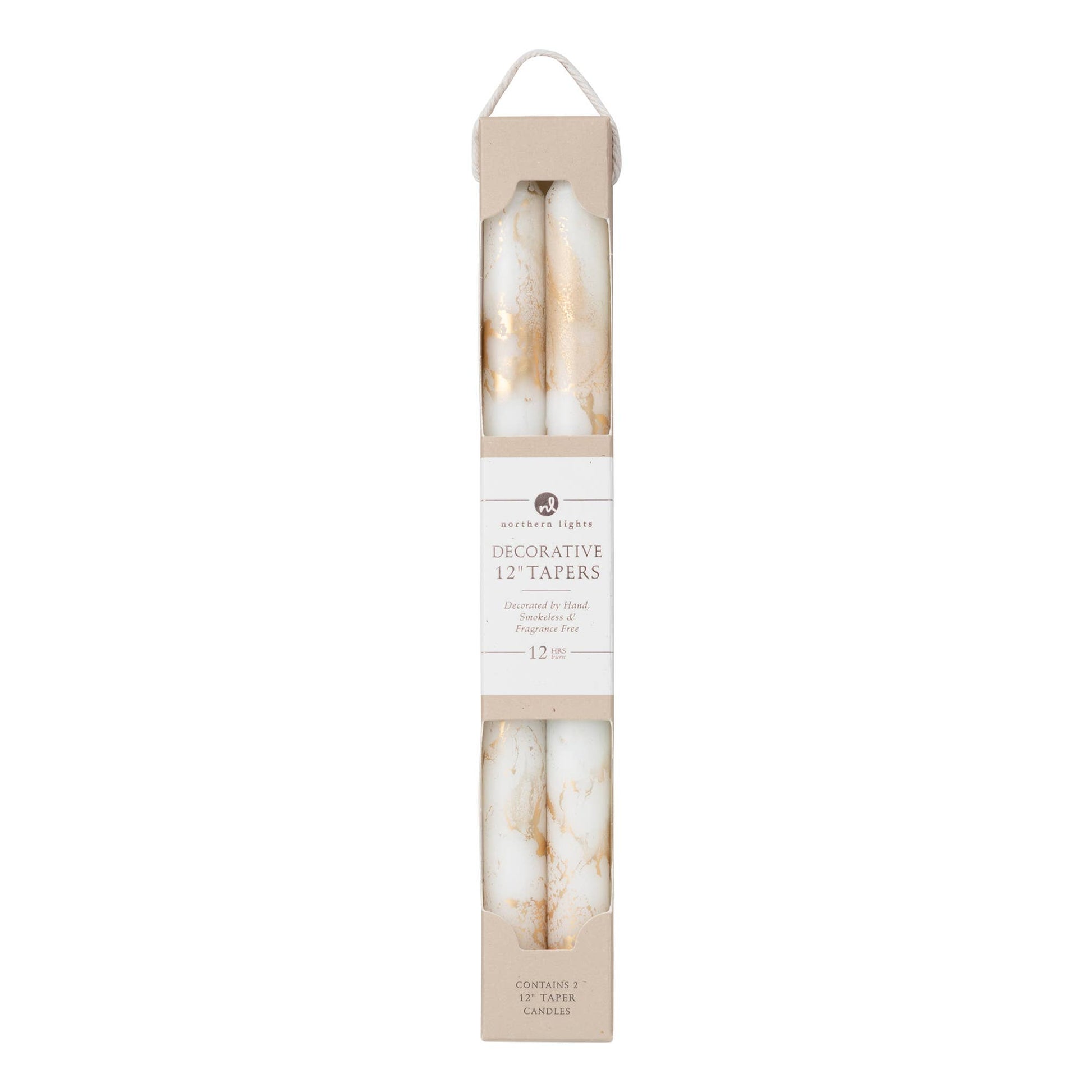 Hand-decorated with gold metallic swirls. Fragrance free & smokeless in a draft-free environment. Fits all standard taper holders. Each Taper burns 1 inch per hour. Plastic-free packaging.