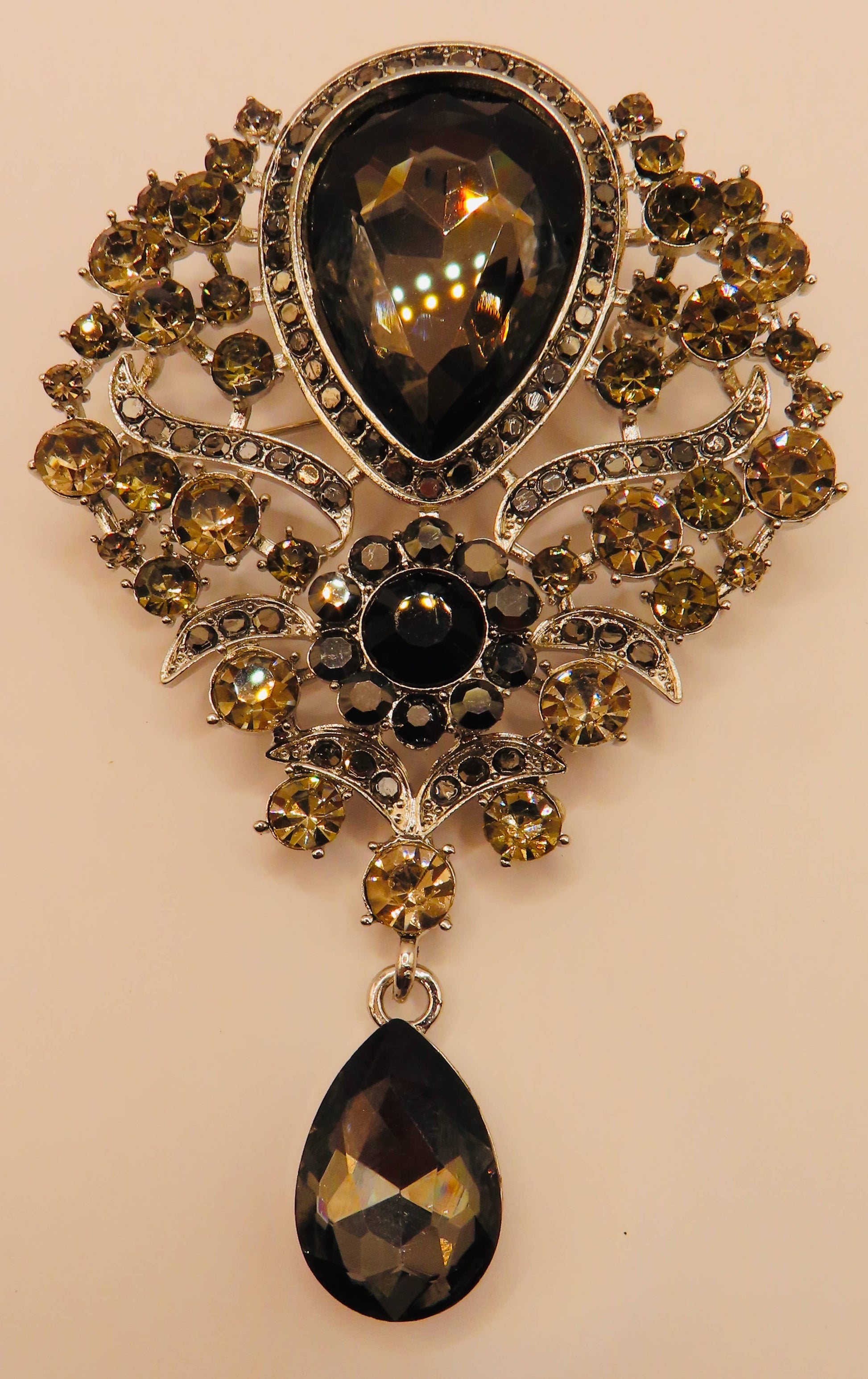 These large crystal brooches are filled with a ton of sparkly rhinestones!! At the bottom another one dangles down. Each one measures about 2 1/4" across and about 3 1/2" long.