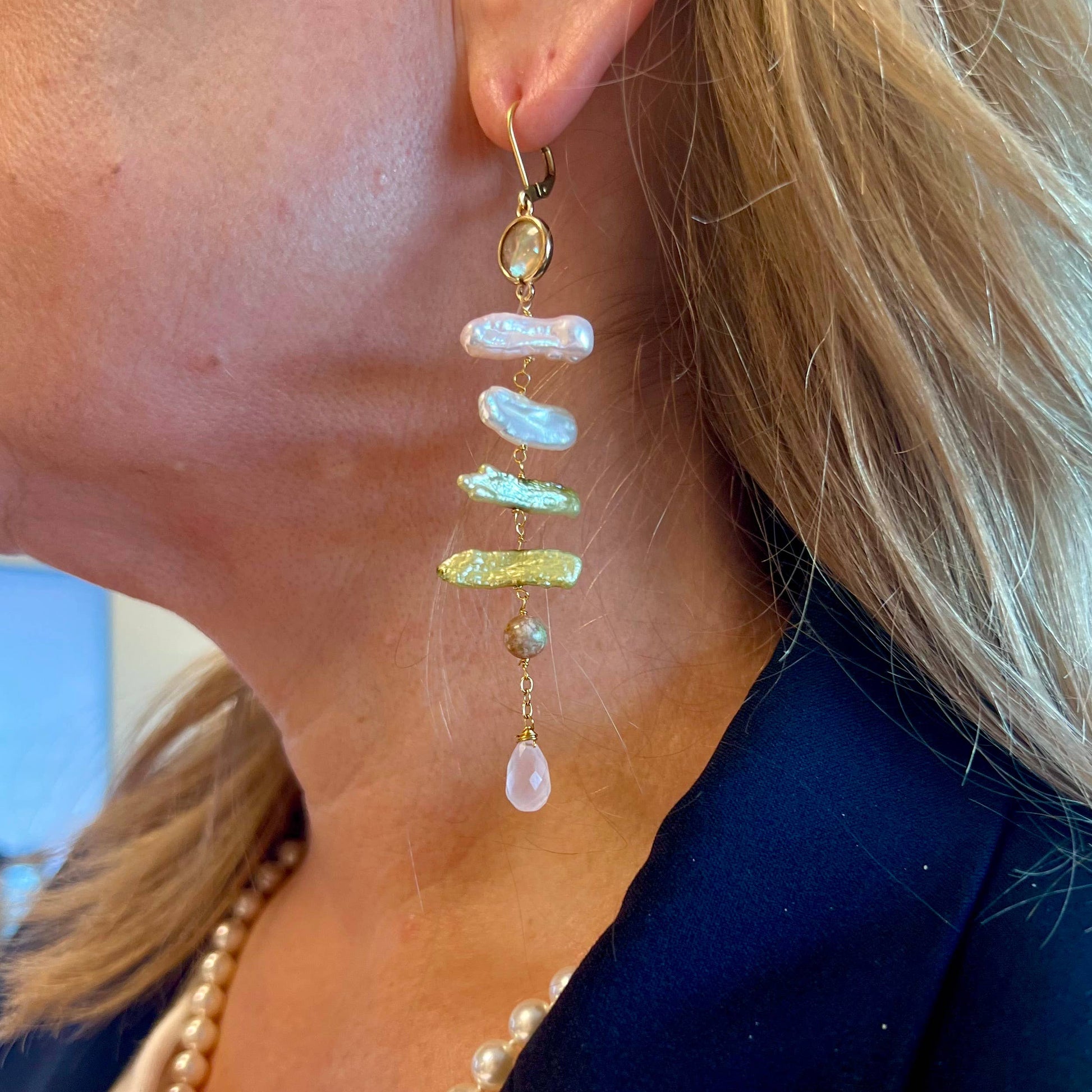 For the statement maker. Gold plated New Zealand paua shell, freshwater pearl sticks, Autumn jasper, faceted rose quartz briolette, gold plated leverbacks, approx. 4".