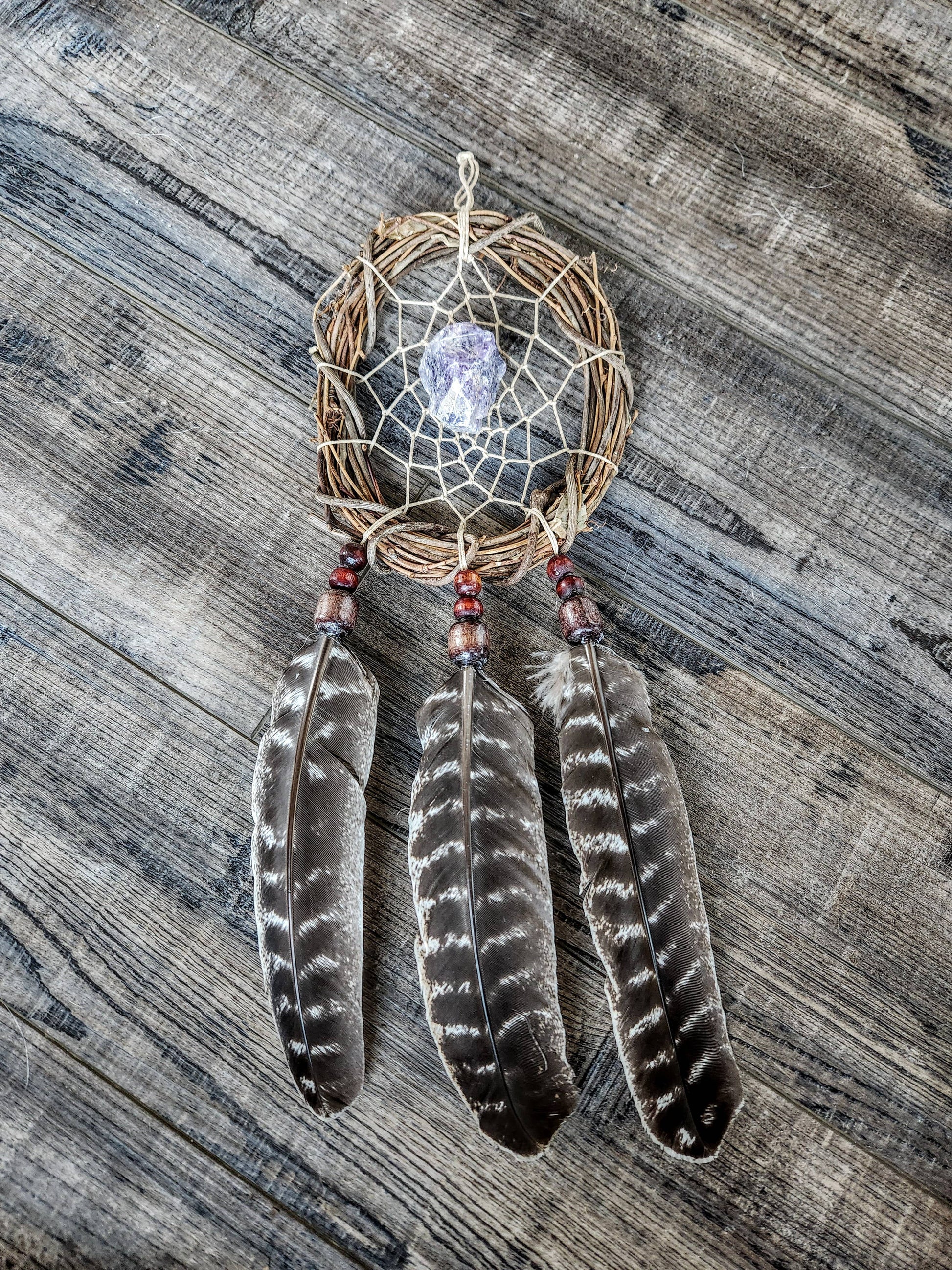 These small wreath dreamcatchers are around 5-6 inches wide and 15-16 inches long. The crystals in the center as well as the types of feathers and beads to match vary per product, but customizations can be made! The images show an example for the mixture that could come in a case of 6 units.