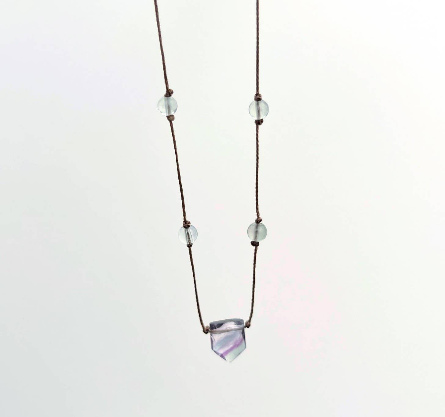 small faceted fluorite shield (shades of purple will vary), small green fluorite accent beads, hand knotted light brown cord (heat set delicate nylon thread with strong durability and resistance to fraying), sterling silver clasp