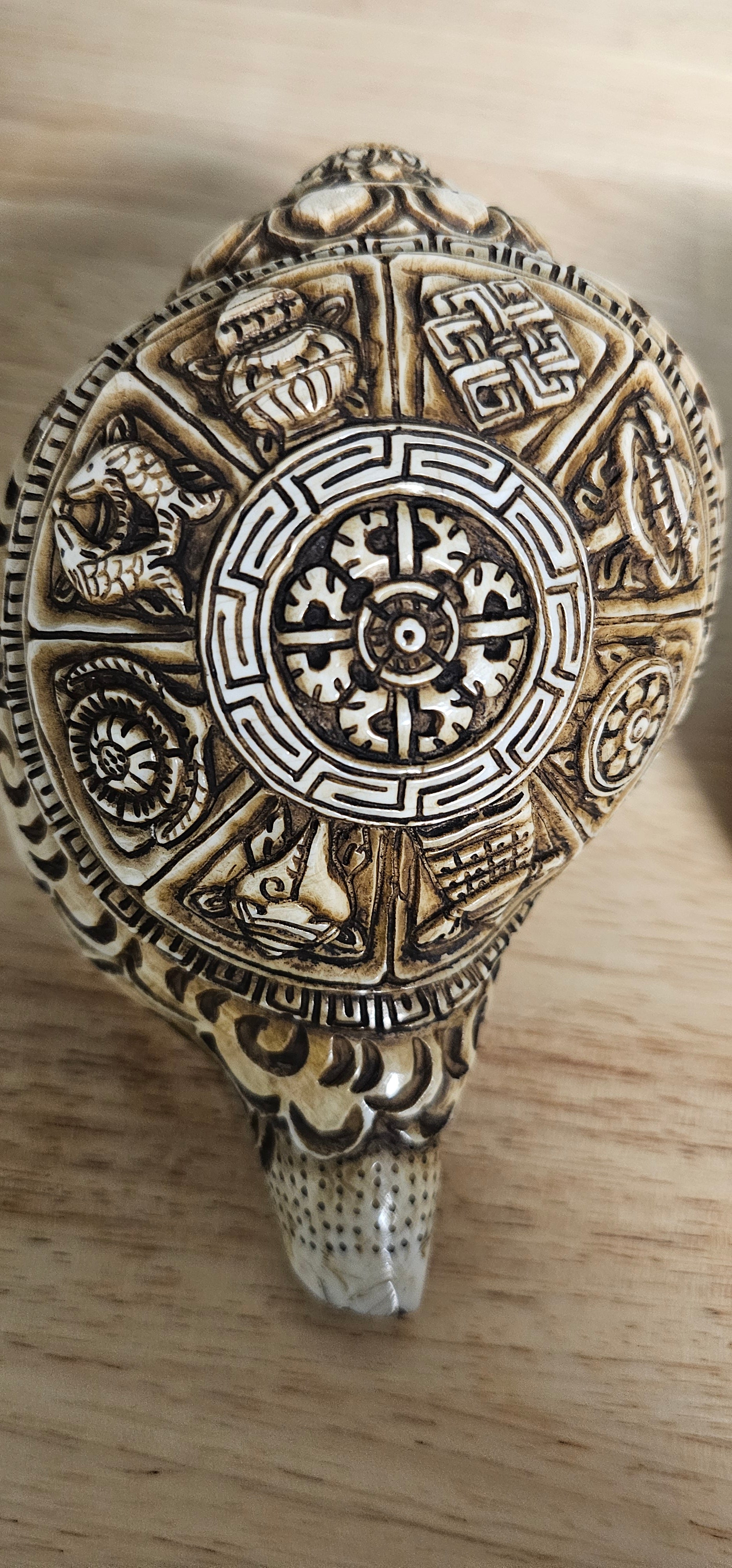 A shankha is a sacred conch shell used in Hindu religious rituals as a trumpet and a symbol of the god Vishnu, and also as a symbol of marital status in the form of white bangles (shankha pola) worn by Bengali Hindu married women. The shankha has a religious importance in Hinduism, and is considered auspicious, symbolizing creation and bringing good luck and abundance.