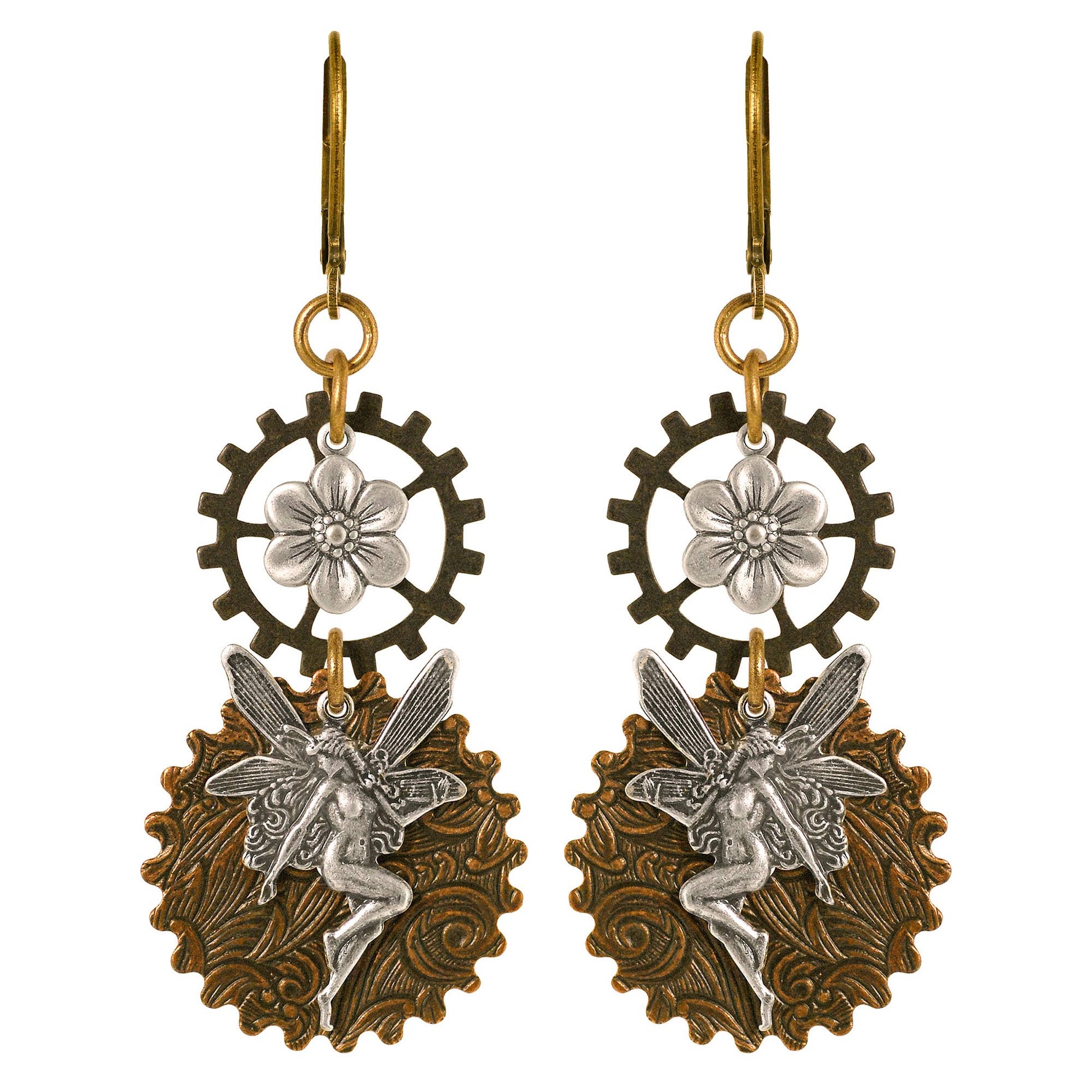 "Steam Fairy" Steampunk earrings by NoMonet feature a delicate posing fairy. They dangle gently beneath an etched copper gear that serves as her backdrop, along with another smaller darkened brass gear that is accented with a silver flower. These earrings are accented in silver-plated, copper-plated, and darkened brass finishes. Measuring approximately 2 inches from their matching lever-backs, the Steam Fairy Steampunk Earrings are crafted with care using high-quality materials that ensure durability and longevity. The earrings are also lightweight and comfortable to wear, making them perfect for daily wear or special occasions. They are versatile pieces that can complement a variety of styles. Order yours now—these earrings by NoMonet are a must-have for any steampunk enthusiast or jewelry lover. With their intricate design, high-quality materials, and affordable price, these earrings are sure to become a cherished addition to your jewelry collection.