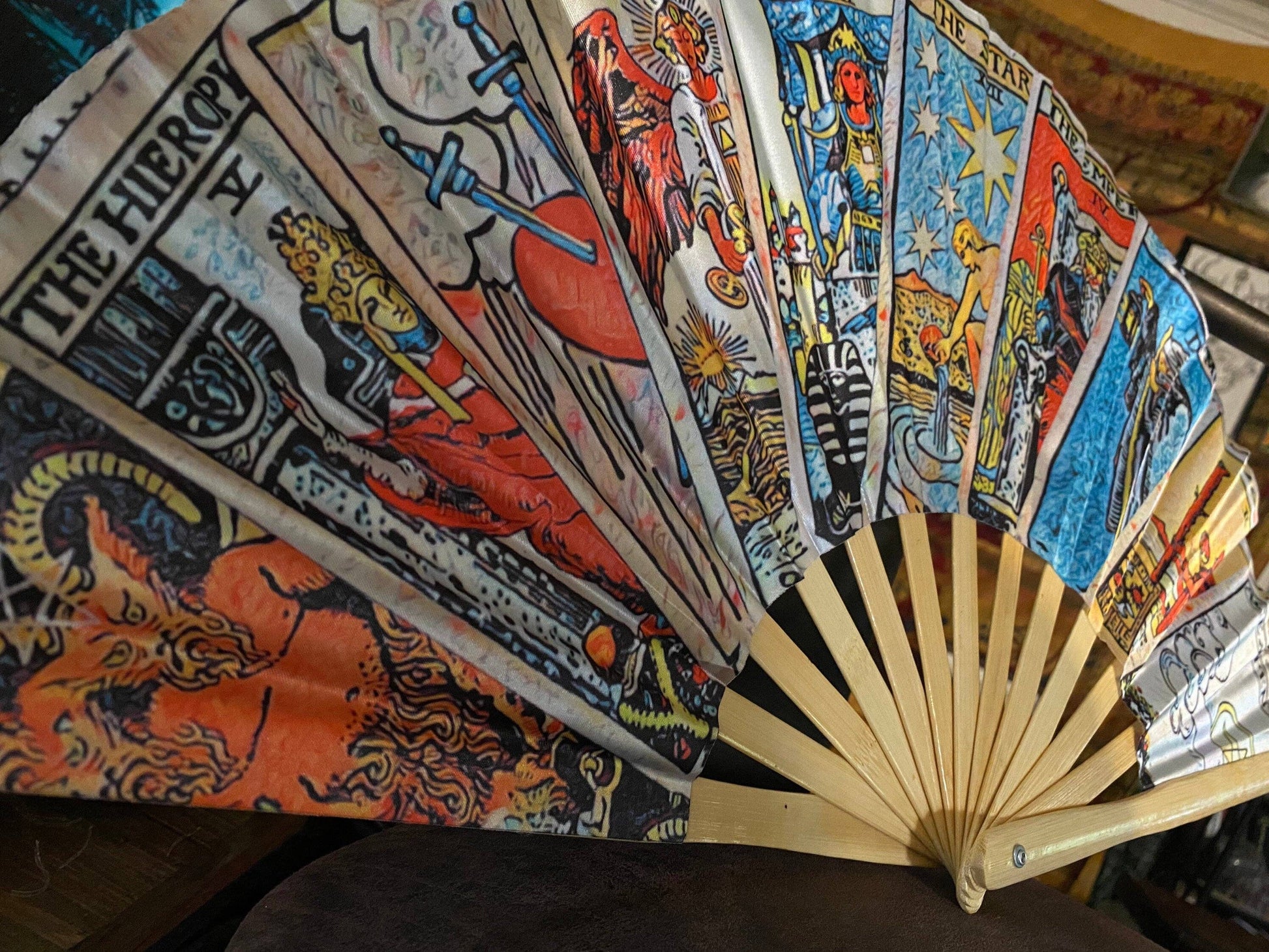 Various Festival Fans- vibrant hand fan inspired by the mystical world of tarot cards! Designed by Enlighten Clothing Co. artist Justin Chamberlain. Fans features intricate illustrations bring a mystical touch to your festival wardrobe. Made from sturdy bamboo wood and sublimated acrylic fabric, this fan is not only durable but also provides a refreshing gust of wind to keep you cool during those long festival days or nights. The sublimated fabric ensures the design will never fade or bleed through, so you can enjoy the stunning artwork for years to come.