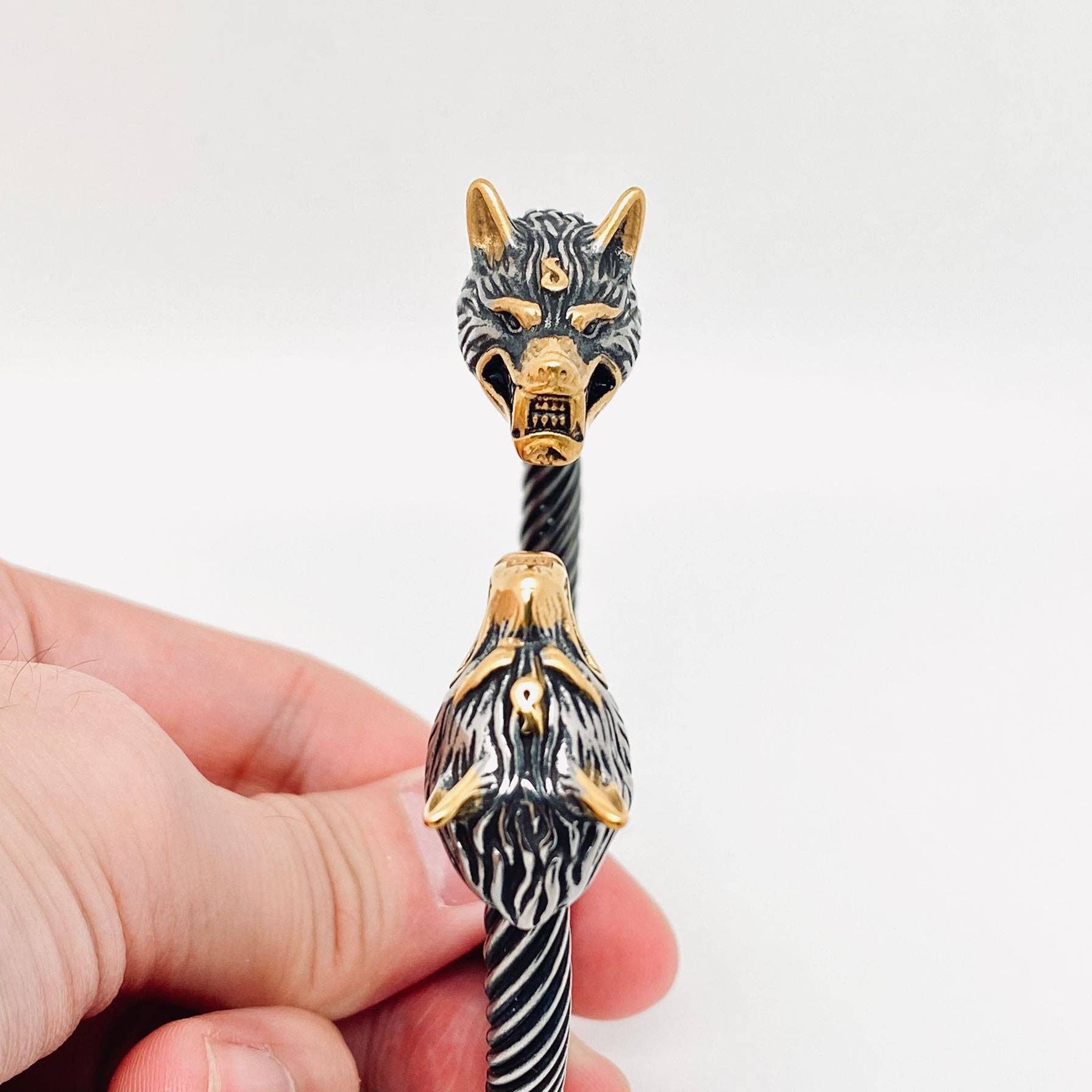 Viking Double Wolf Head Men's Stainless Steel Bangle - MJ/BC: Steel color